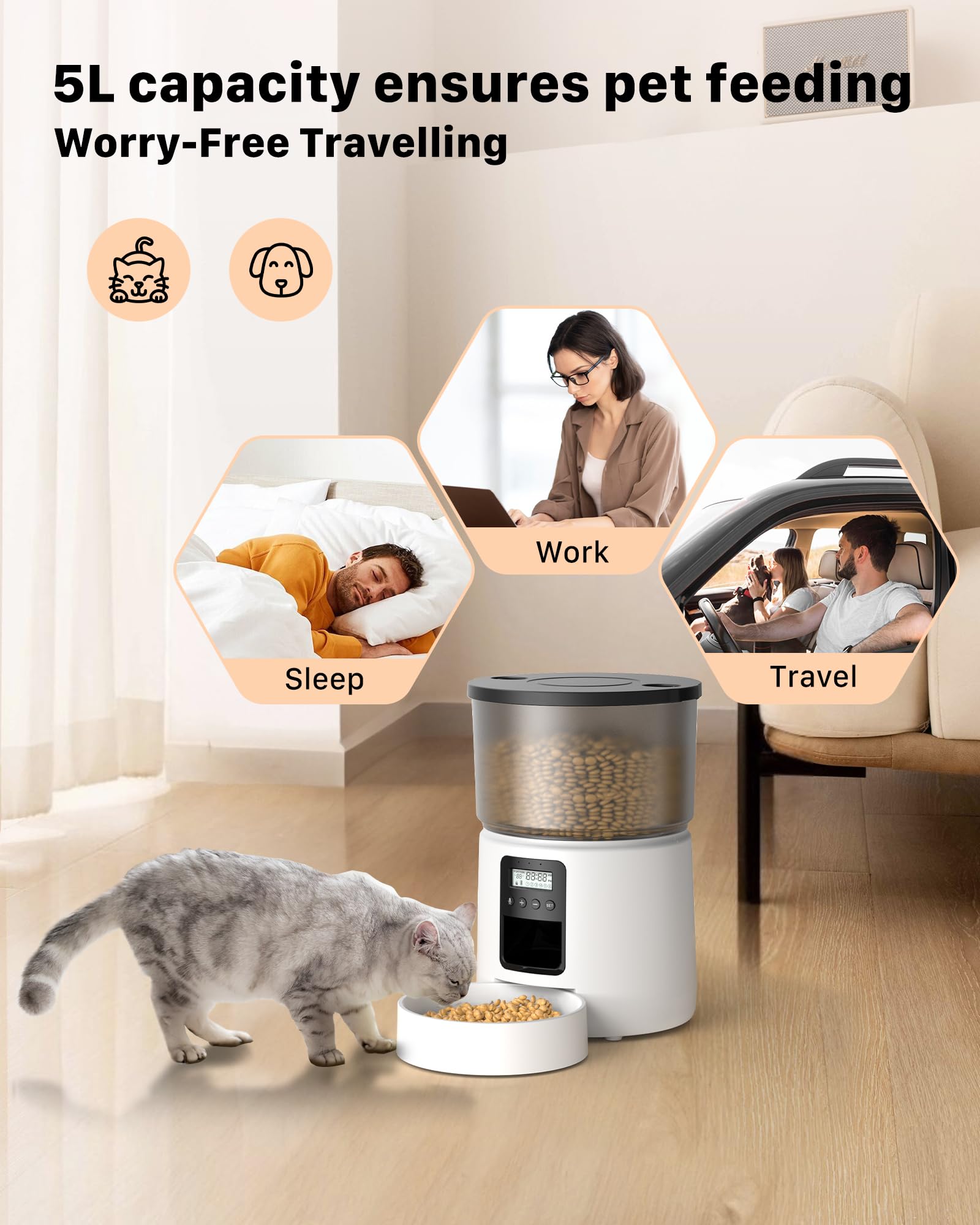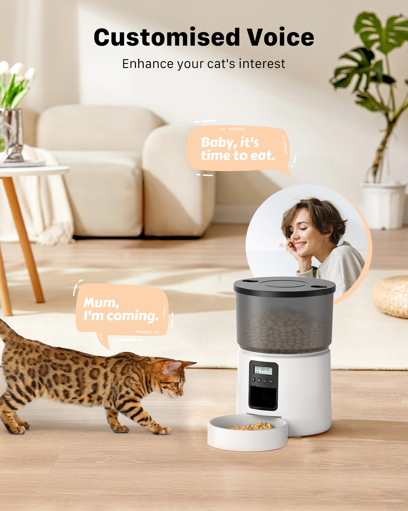 - 【3L Capacity, Happy Traveling】 Mom went out and she left cat feeder to keep me company. Cat feeder can provide me with food for 15 days. Mom doesn't have to worry that I will be hungry. I am happy that my mom can have a pleasant trip too! Mom designed a feeding plan for me. Cat feedercan set 1-6 meals per day, and each meal can set 1-9 servings (11g per serving). I am now a good cat who eats on time.